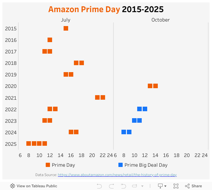 This is a minimalist visualization that marks the days of Amazon Prime Day and Amazon Prime Big Deal Day since 2015.