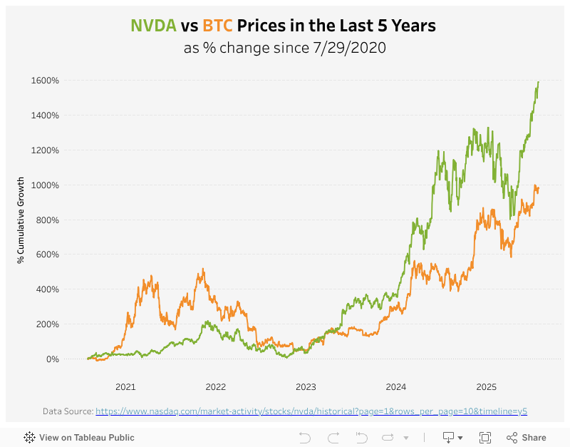 This chart calculates the cumulative price growth, anchored on the BTC/NVDA price on 7/29/2020 (5 years ago).